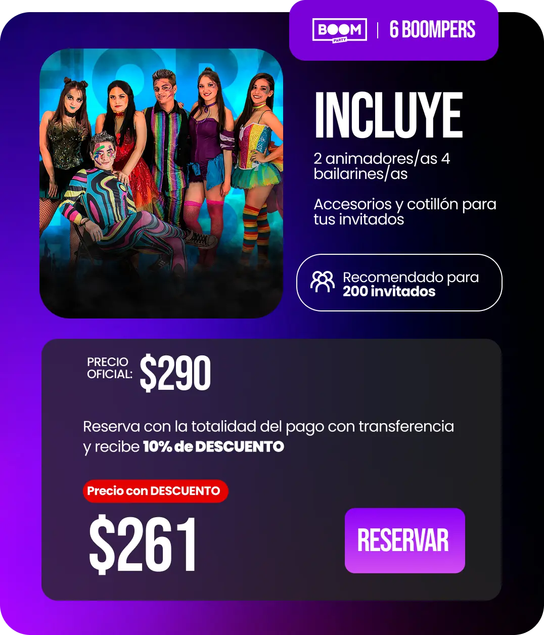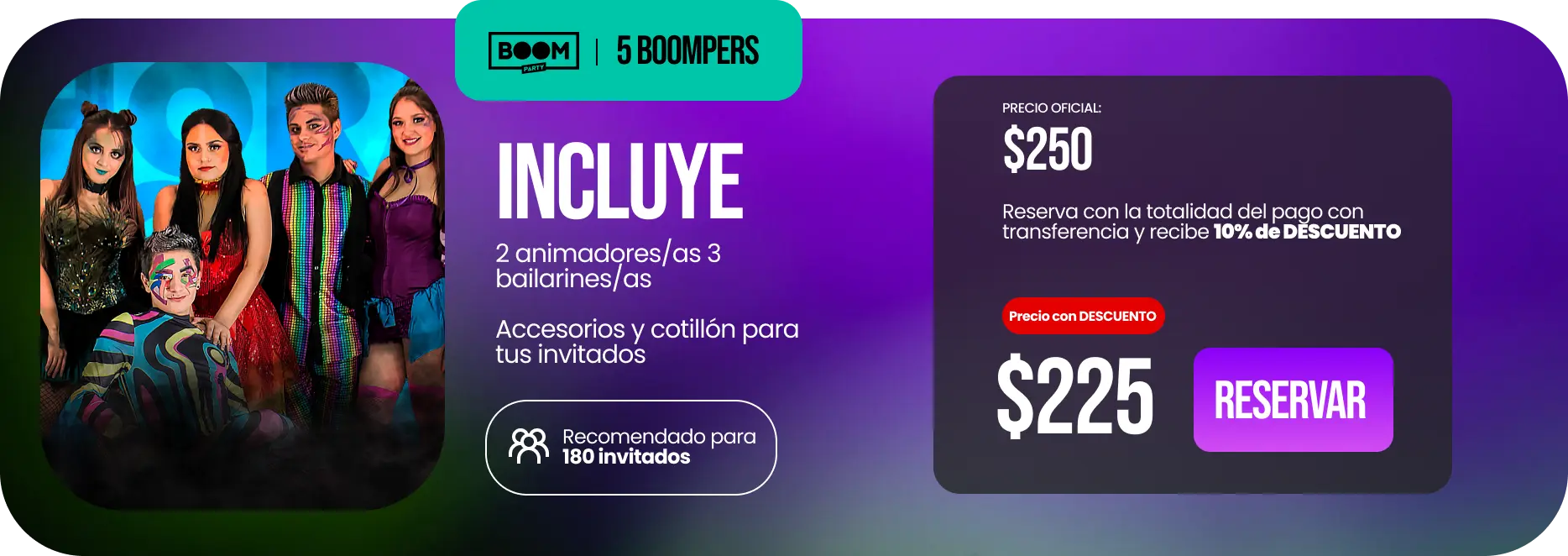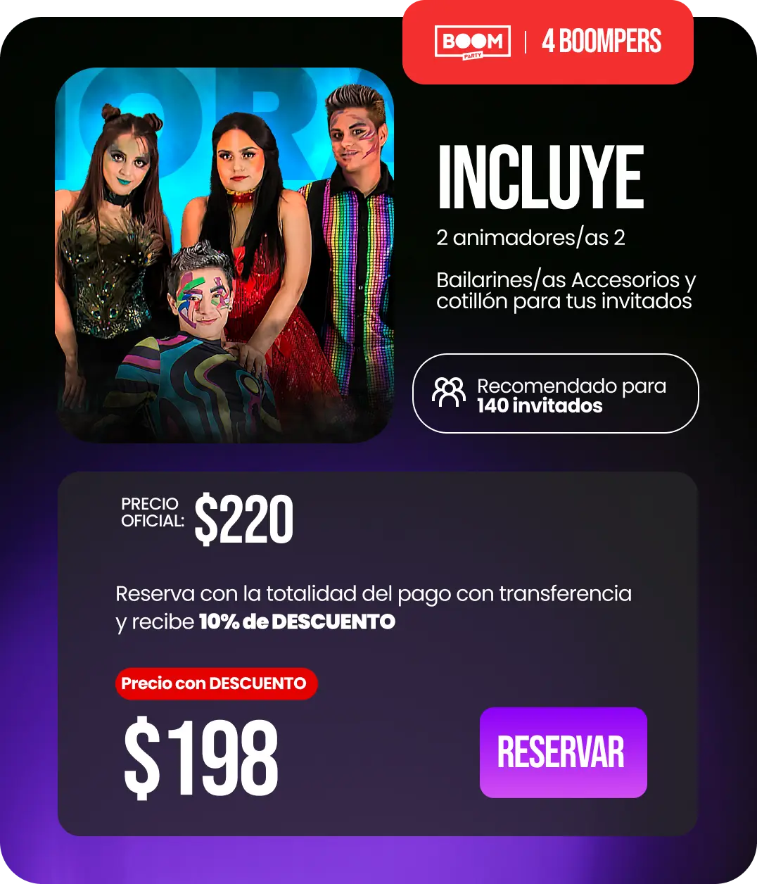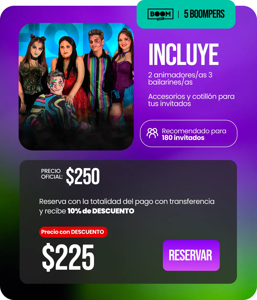 En Boom Party, no solo tenemos experiencia, ¡tenemos pasión por lo que hacemos! Nuestro equipo de boompers está formado por artistas con personalidades vibrantes y energéticas que contagiarán a todos tus invitados. Cada uno de ellos se asegurará de que el aburrimiento no tenga lugar en tu evento y que la diversión esté en su punto máximo. ¡Prepárate para vivir una experiencia inigualable!