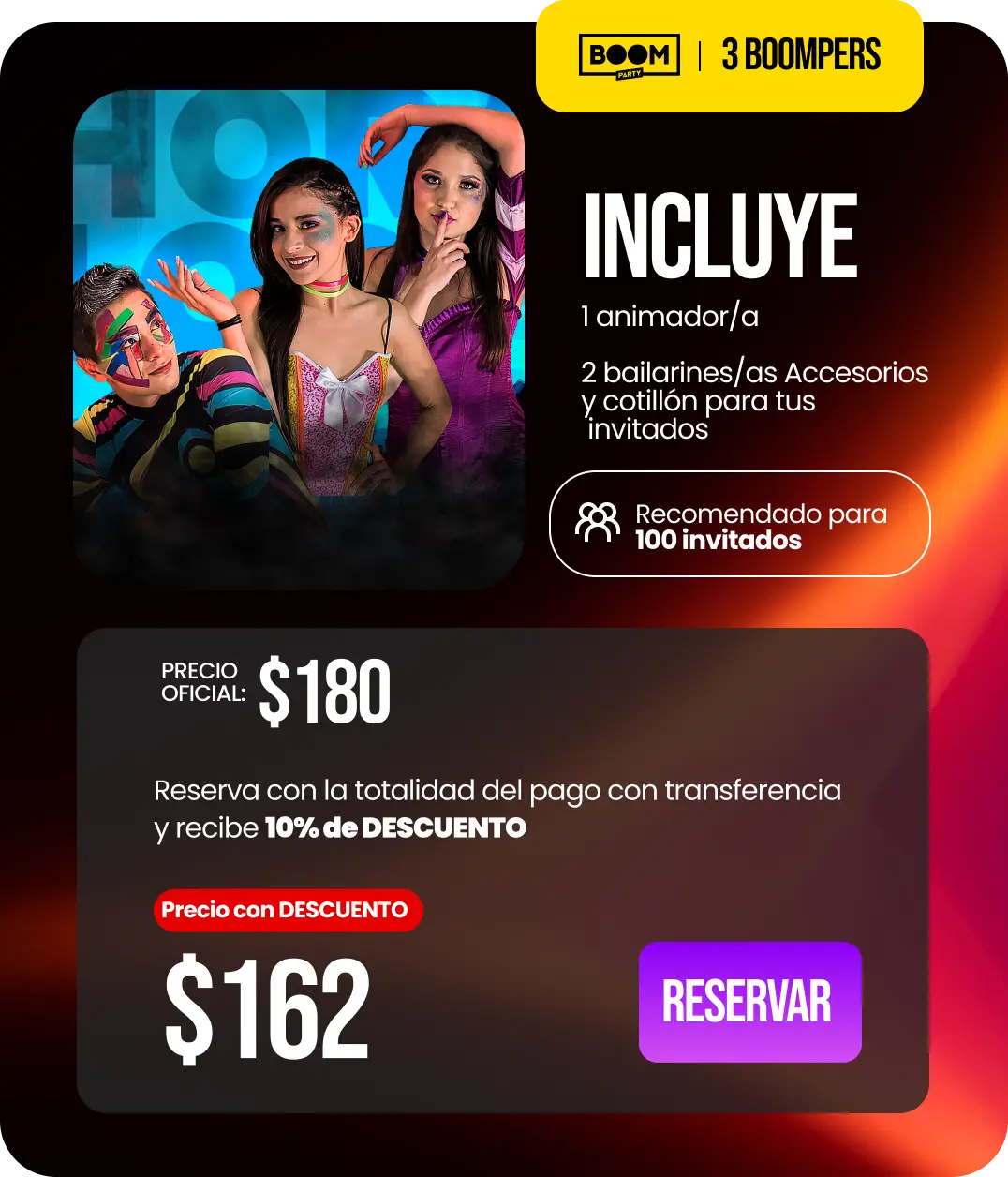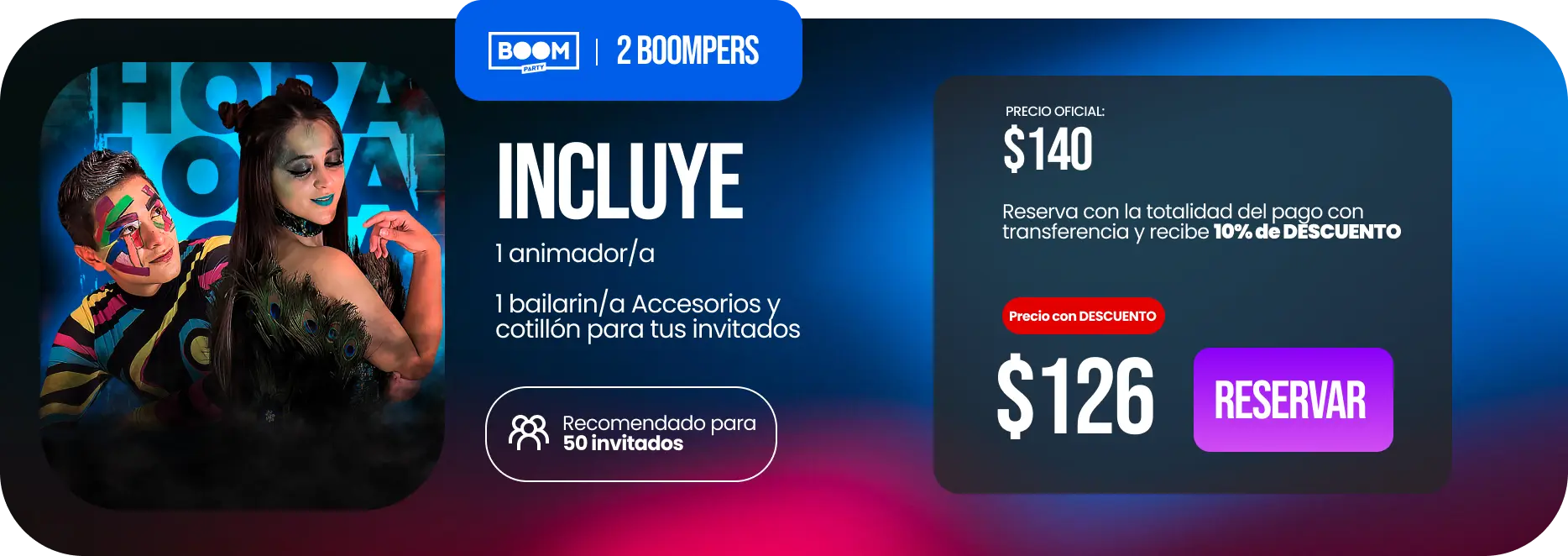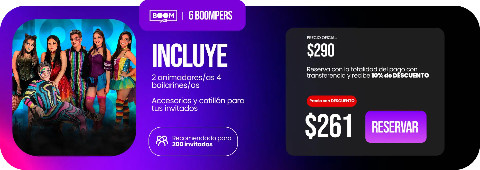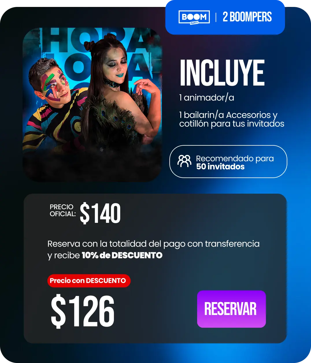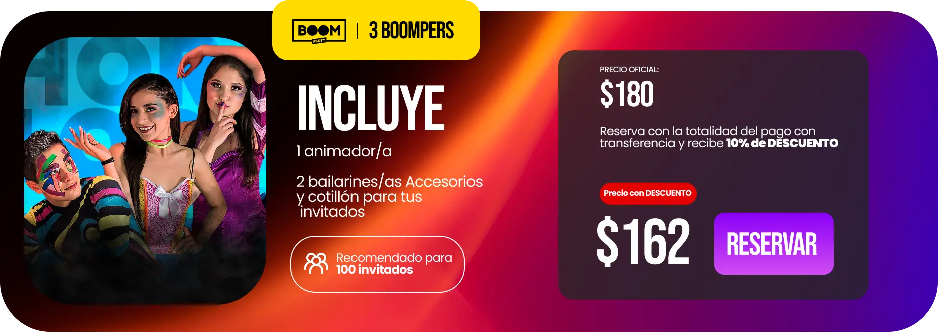 En Boom Party, no solo tenemos experiencia, ¡tenemos pasión por lo que hacemos! Nuestro equipo de boompers está formado por artistas con personalidades vibrantes y energéticas que contagiarán a todos tus invitados. Cada uno de ellos se asegurará de que el aburrimiento no tenga lugar en tu evento y que la diversión esté en su punto máximo. ¡Prepárate para vivir una experiencia inigualable!
